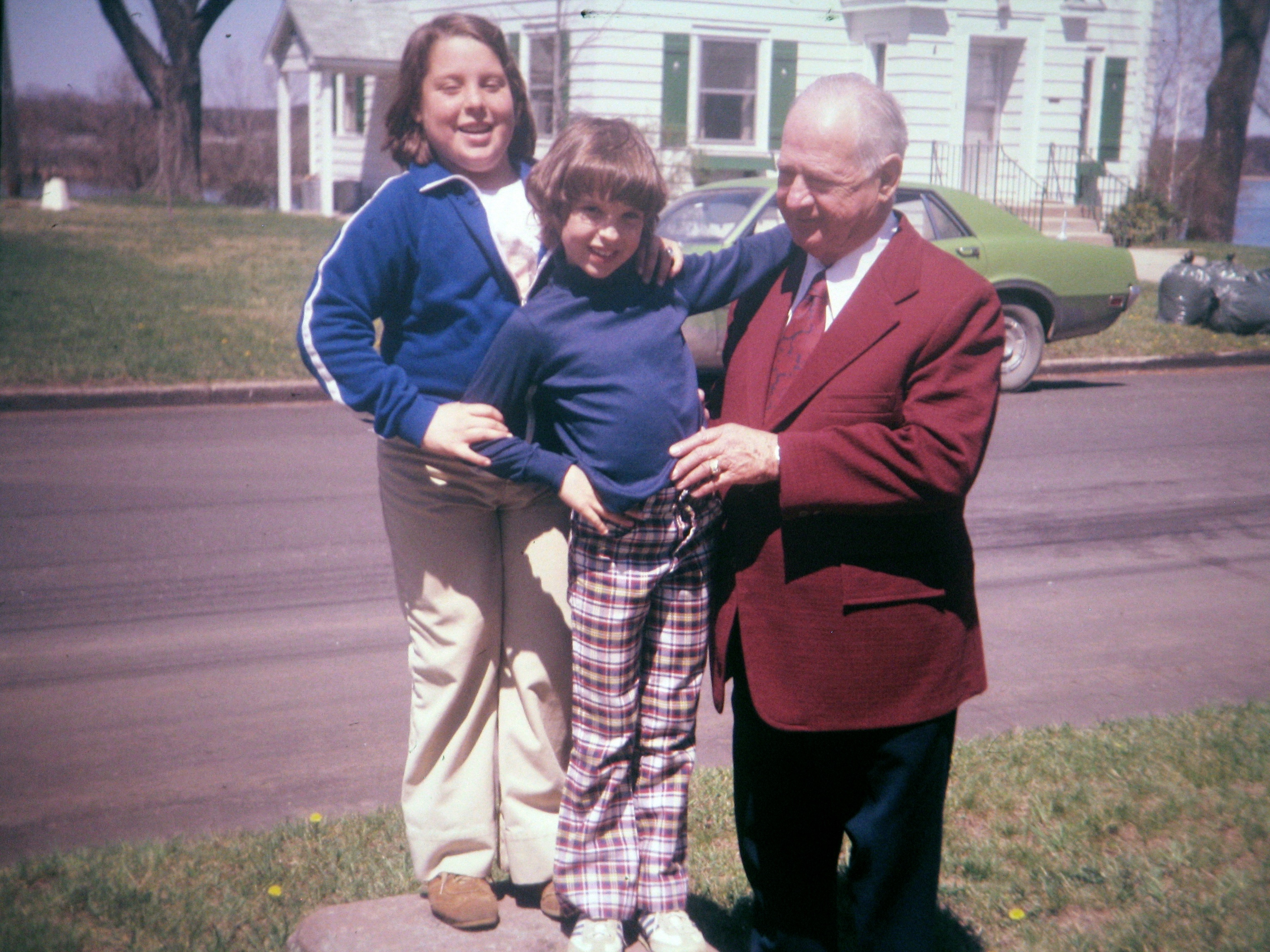 Marghi and Amy Hanneman stand on the carriage stone next to Grandpa Carl F. Hanneman in the 1970s.