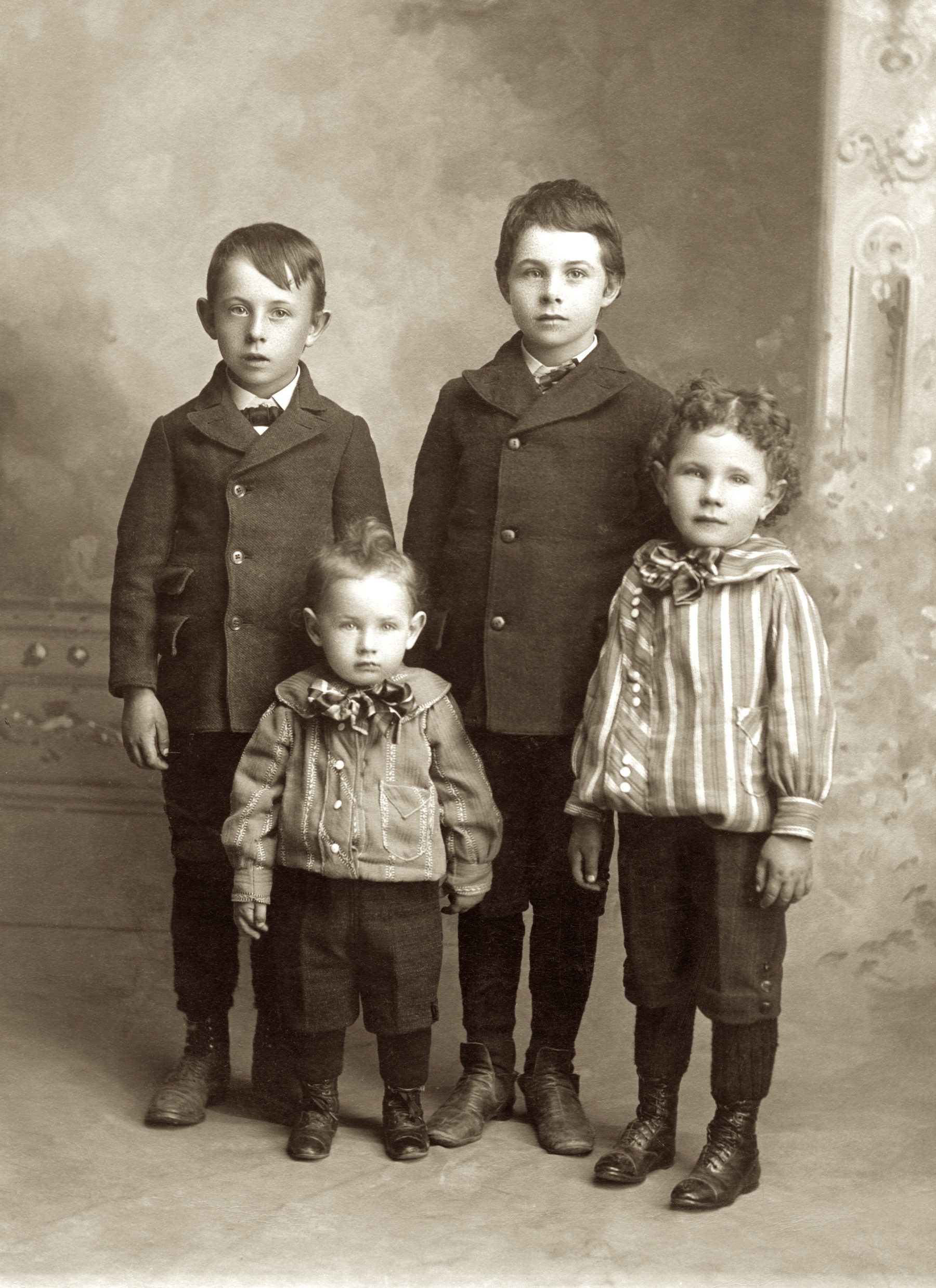 In the front row are Carl (at left) and Wilbert George (1899-1987). In the back are Frank Herman Albert (1895-1947) and Arthur John (1893-1965). The firstborn of this family, Charles M. Hanneman, died just after his birth on November 24, 1891.