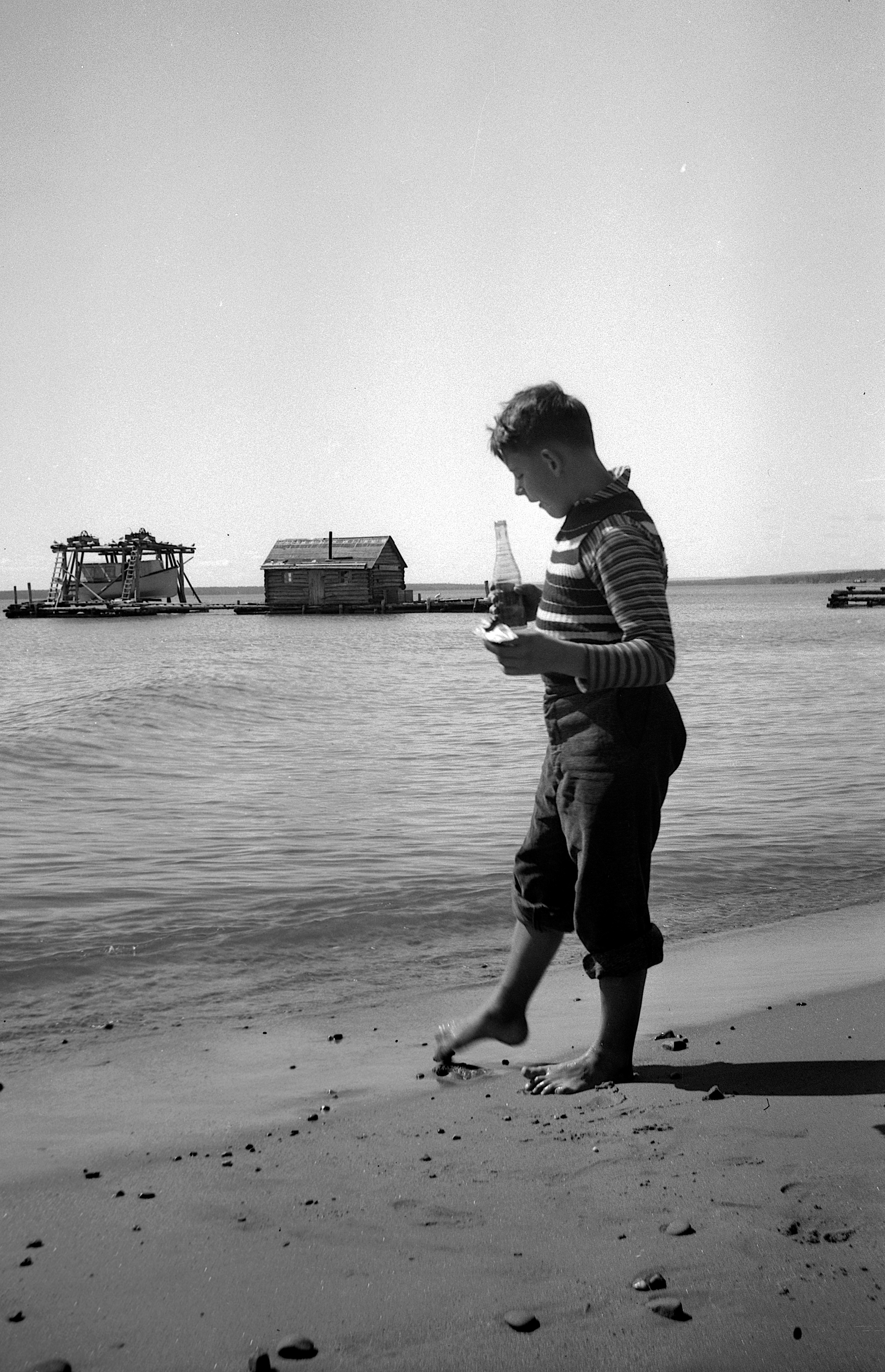 David D. Hanneman with his toe in the sand at Madeline Island, circa 1942.