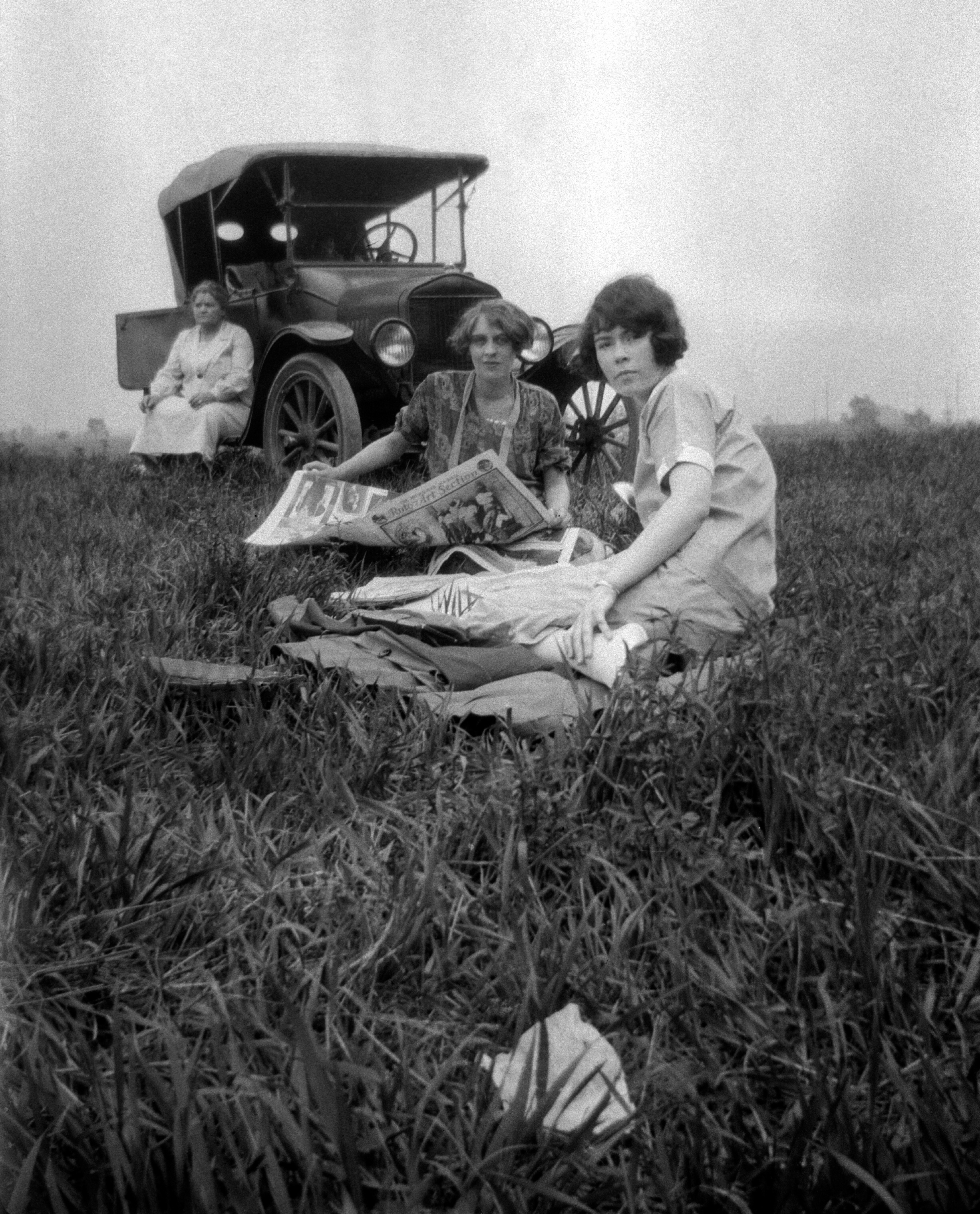 Ruby V. Treutel (center) relaxes with the Sunday paper near Milwaukee’s Juneau Park in 1924. Ruby was visiting her fiance, Carl F. Hanneman (1901-1982), who was studying pharmacy at Marquette University. At front is Ruby’s sister, Nina H. Treutel (1914-2005). The woman near the car is unidentified.