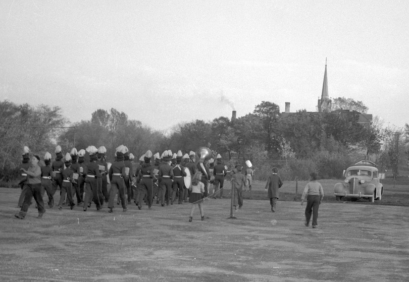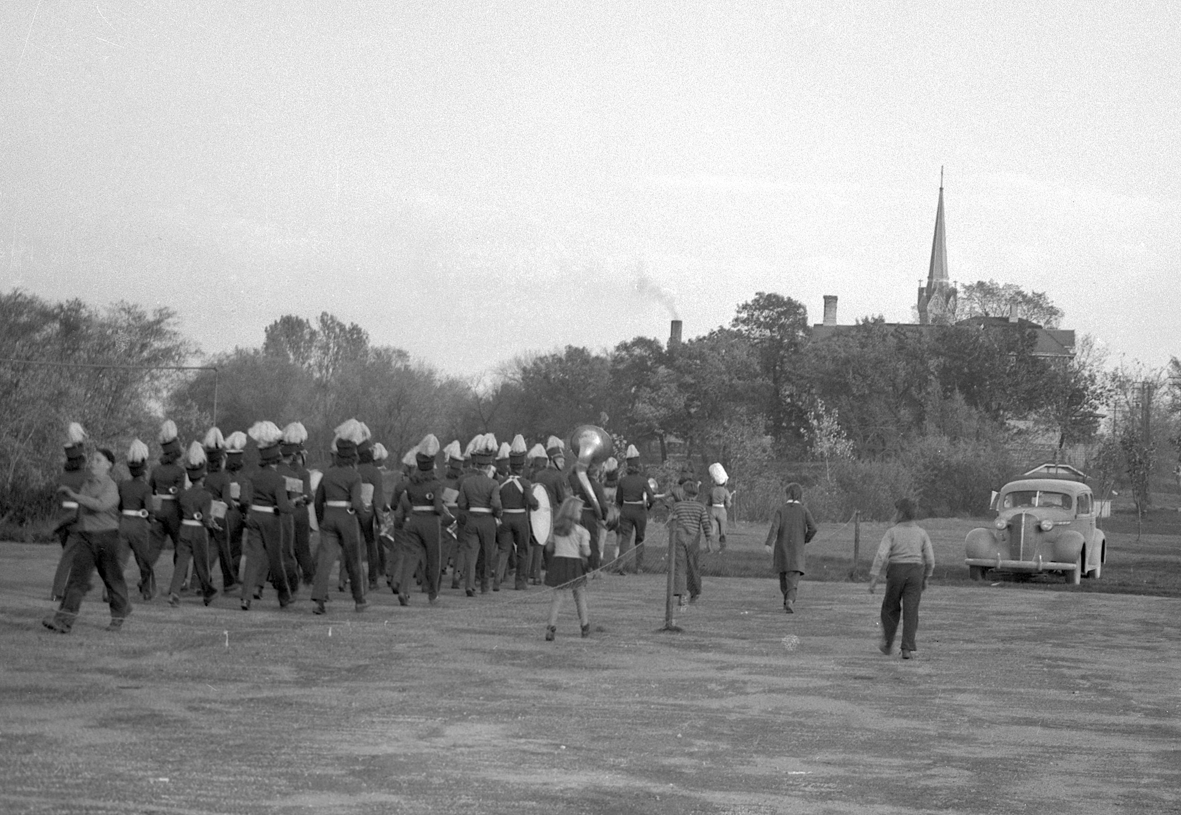 The Mauston High School Band after leaving the football field during a homecoming game in the 1940s.
