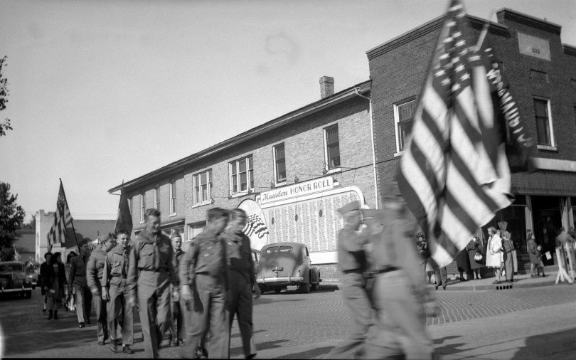 Mauston Boy Scouts enter the parade line, circa 1943. The town’s military honor roll can be seen on the side of the building.