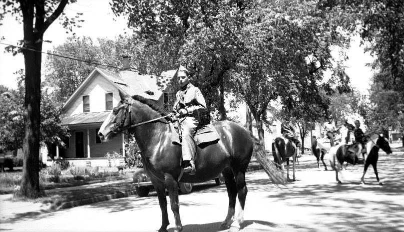 David D. Hanneman prepares to ride a horse in a Mauston parade, circa 1942.