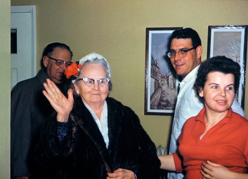 Coming in the door are Grandma Margaret Mulqueen and Grandpa Earl J. Mulqueen Sr., along with Mom and Dad, David D. and Mary K. Hanneman.