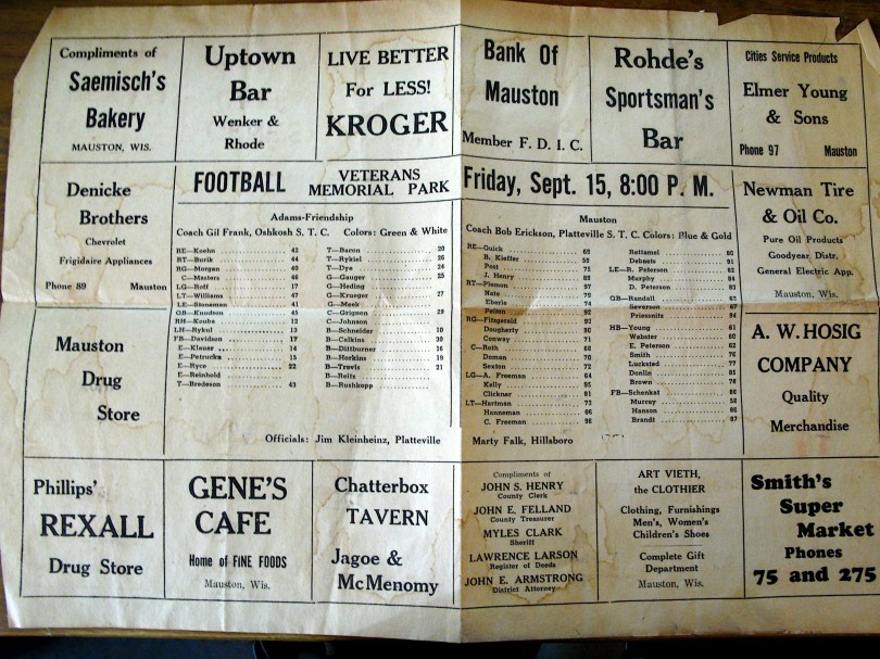 A Mauston game program from September 1950. Note the team plays at Veterans Park instead of Riverside as in earlier years.