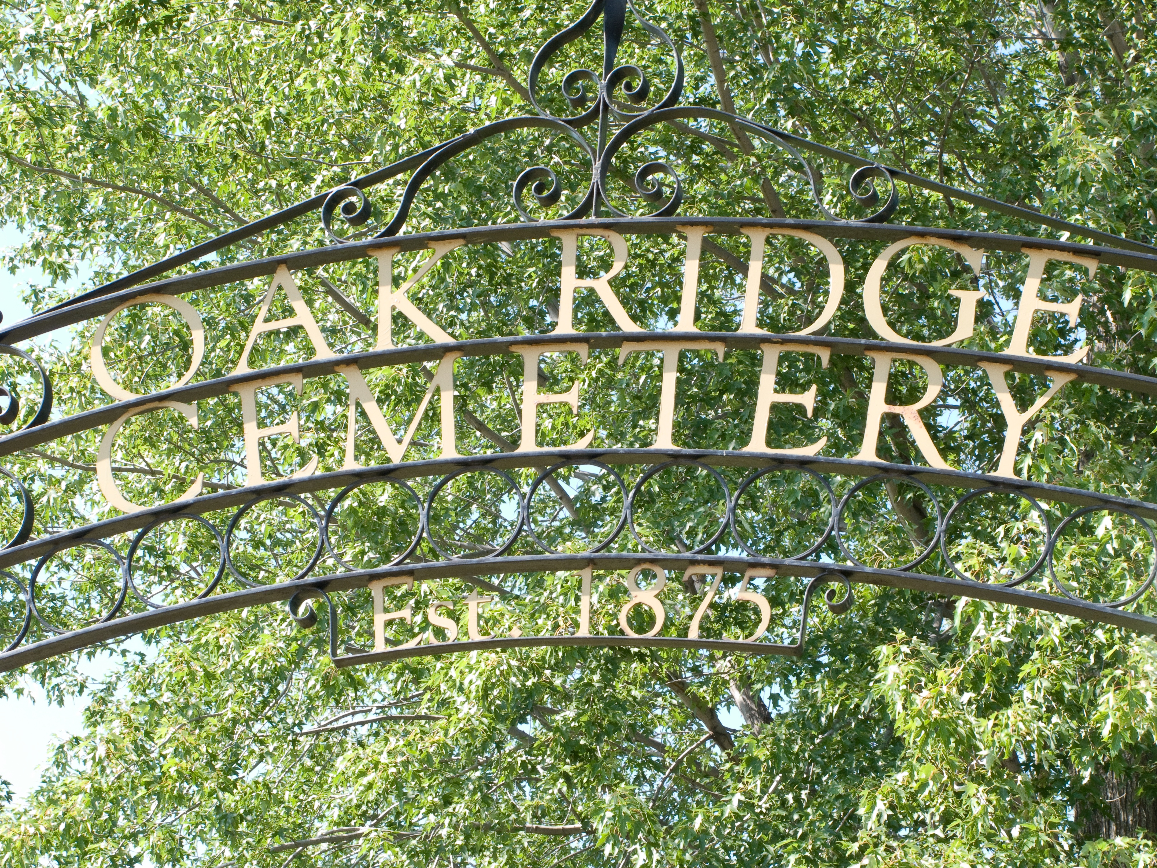 Old iron sign over the entry to Oak Ridge Cemetery, East Troy, Wis.