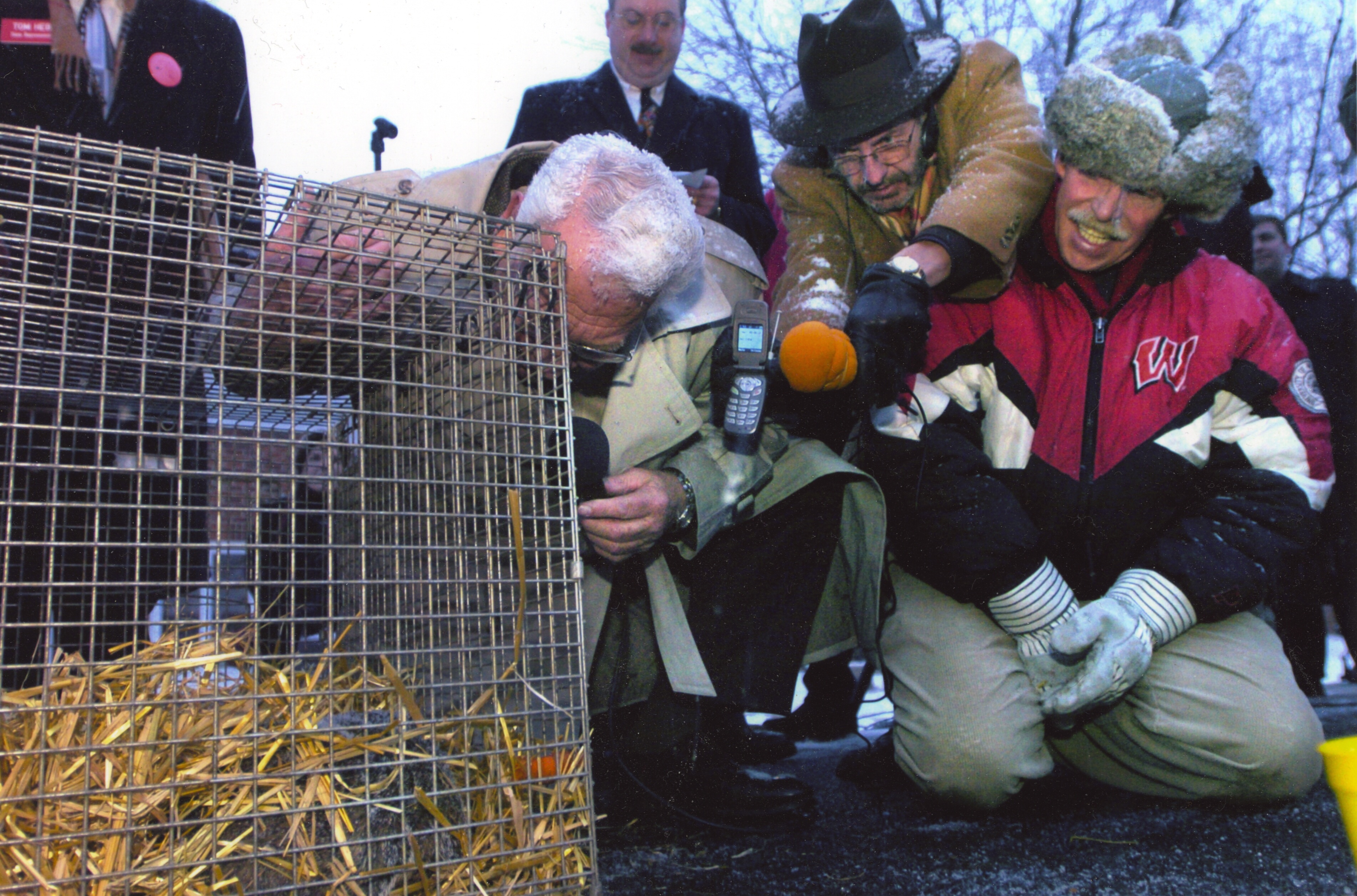 Mayor Dave Hanneman leans down to listen to the “groundhogese” spoken by Sun Prairie’s famous weather prognosticator, Jimmy the Groundhog.