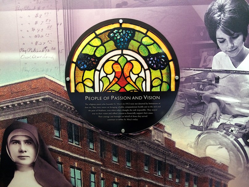 A portion of the stained glass detail is used in a history display in the old lobby of St. Mary’s Hospital in Madison, Wis.