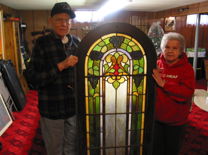 David and Mary Hanneman with a section of stained glass window on the day the windows were picked up for use at St. Mary’s Hospital.