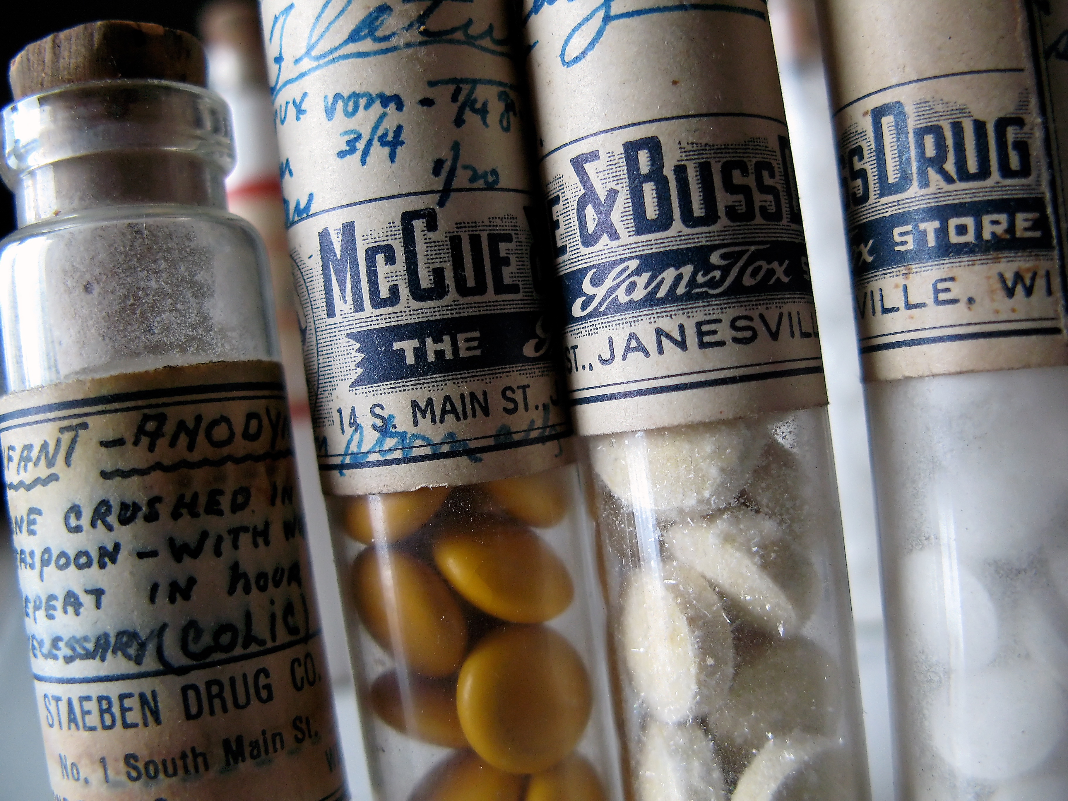 This collection of vials are from Carl F. Hanneman’s portable pharmacy kit used early in his career as a druggist.