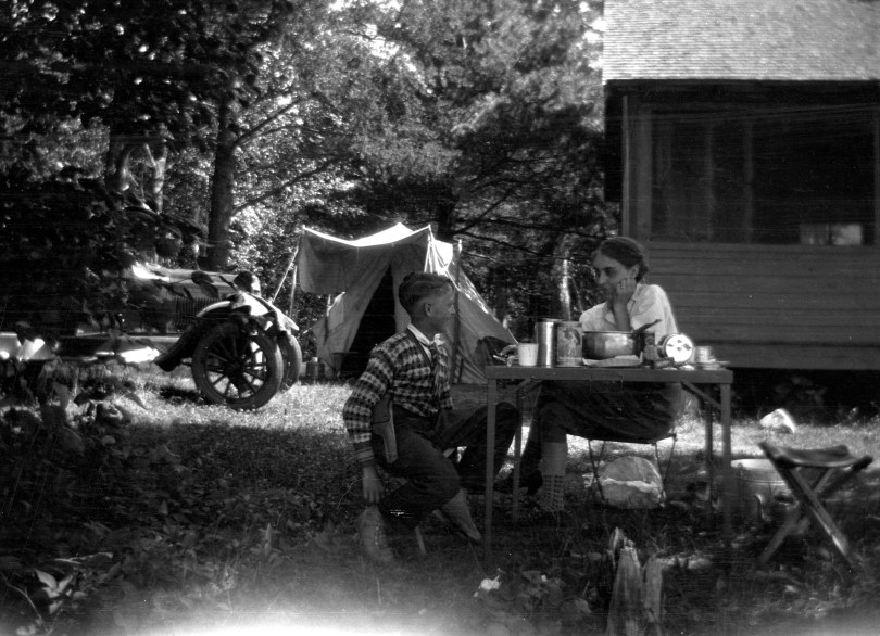 An unidentified boy sits outside of a cottage near Hayward, Wis., with Ruby V. (Treutel) Hanneman (1904-1977) in July 1925. Ruby and new husband Carl F. Hanneman (1901-1982) were on their honeymoon.