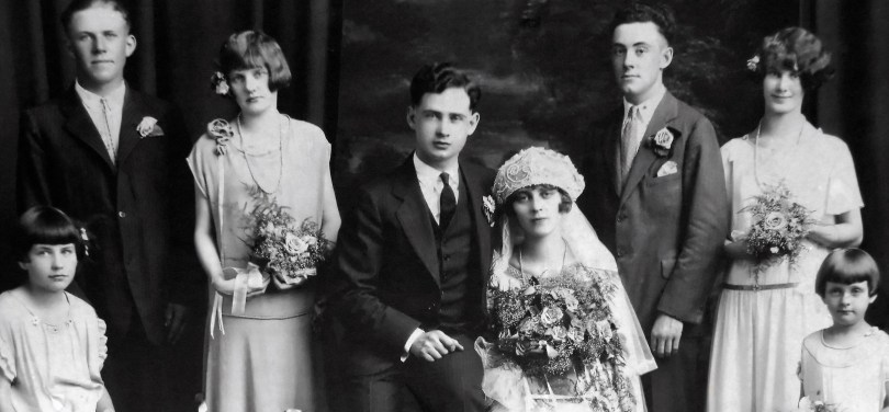 The wedding party of groom Carl Henry Frank Hanneman, 23, and Ruby Viola Treutel, 21. Wedding was July 14, 1925 at St. James Catholic Church, Vesper, Wis.