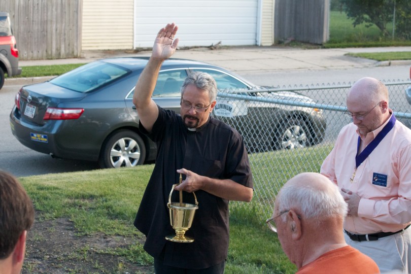 Father Mark Jones blesses the new home of the K of C in Racine, Wis., while Grand Knight Joe Hanneman (at right) looks on.