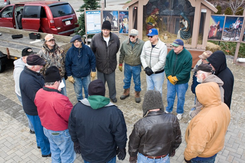 Knights and other Christian volunteers pray together after setting up a Nativity scene on Monument Square in Racine, Wis.