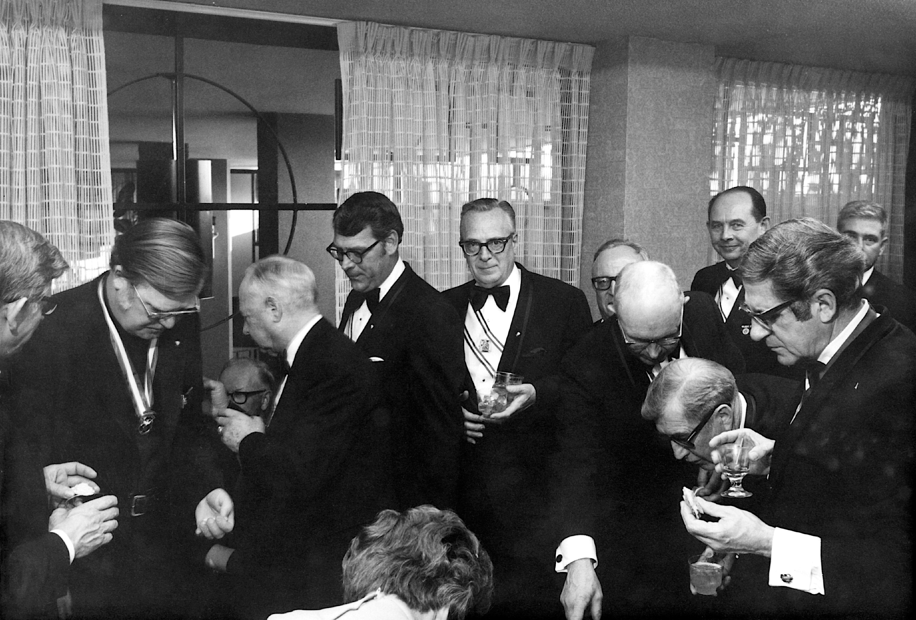 David D. Hanneman (left of center, dark hair), stands just behind his father, Carl, at the reception following the Knights of Columbus Fourth Degree exemplification.