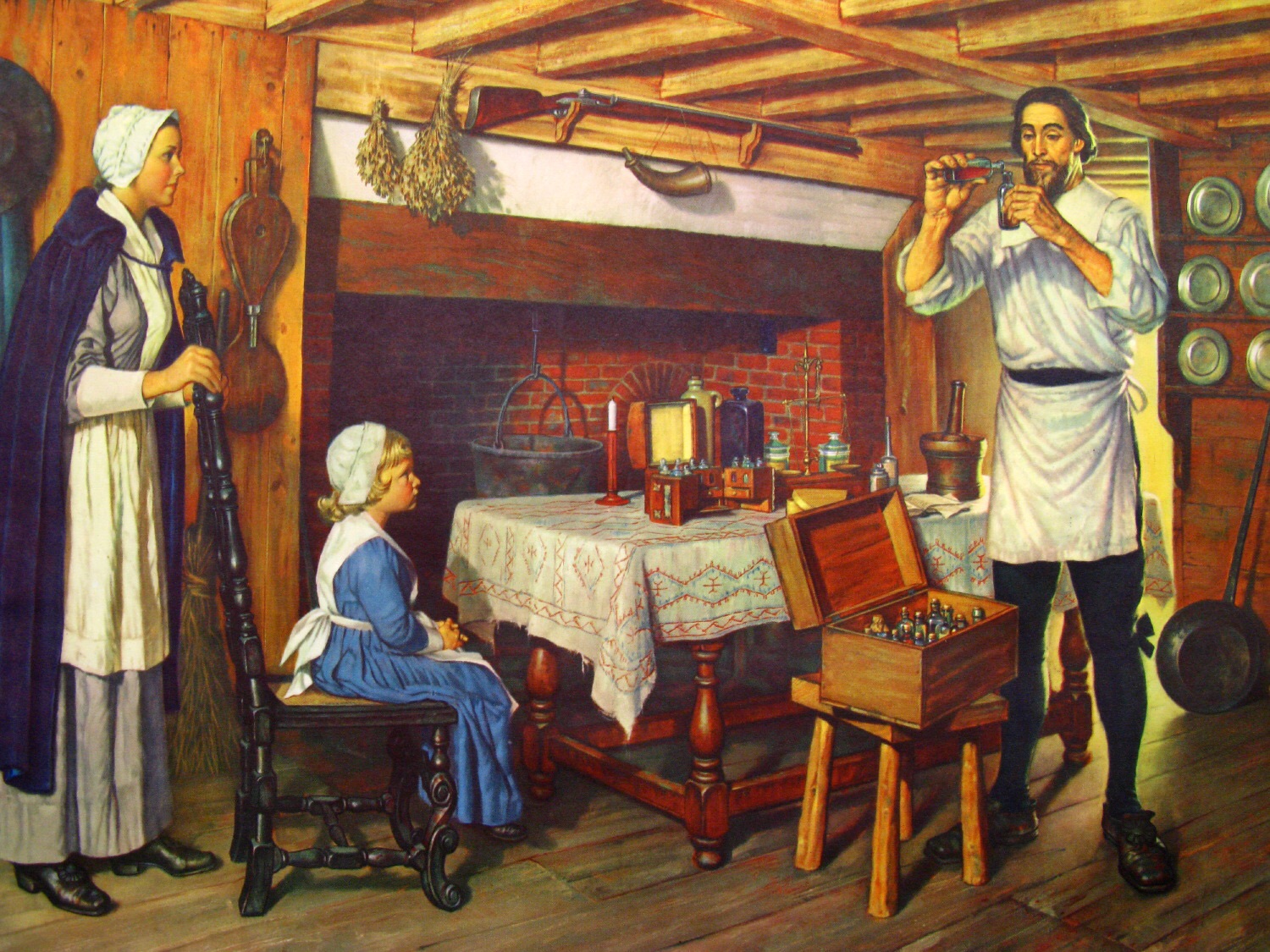 Many Europeans “of quality and wealth, particularly those who were non-conformists in religion” were attracted to the possibilities of the American Colonies. From Britain came John Winthrop, first Governor of Massachusetts Bay Colony and founder of Boston. Governor Winthrop, unable to induce professionals to the Colony, sought advice from English apothecaries and physicians, and added to his small store of imported drugs those derived from plants native to New England. In his home (about 1640), he made available as best he could the “art and mystery” of the apothecary for his citizens.