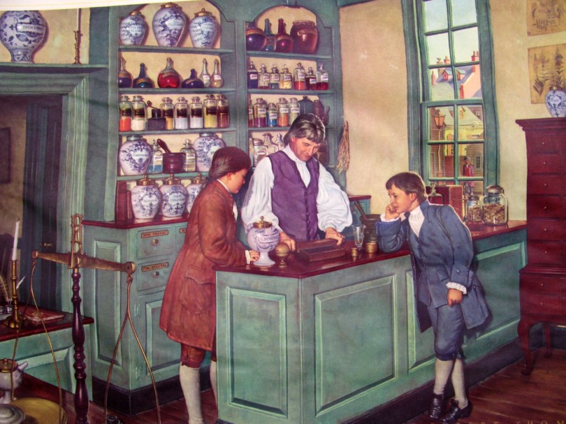 Christopher Marshall, an Irish immigrant, established his apothecary shop in Philadelphia in 1729. During 96 years, this pioneer pharmaceutical enterprise became a leading retail store, nucleus of large-scale chemical manufacturing; a “practical” training school for pharmacists; an important supply depot during the Revolution; and finally, it was managed by granddaughter Elizabeth, America’s first woman pharmacist. Christopher earned the title of “The fighting Quaker” during the Revolution; his sons, Charles and Christopher, Jr., (shown as youths with their father, about 1754) earned individual fame and carried on his fine traditions.