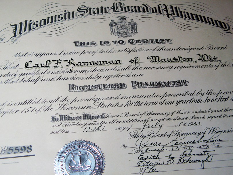 Carl F. Hanneman’s registered pharmacist license, issued in July 1944.