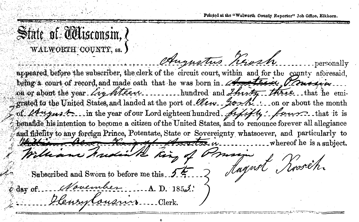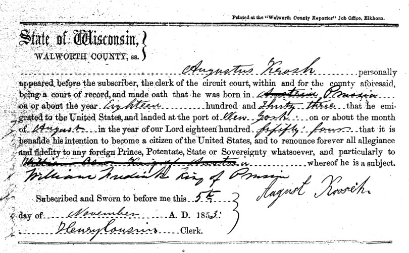 Declaration of Intent for Augustus Krosch December 31, 2014 1226 × 760 Frederick Krosch’s 1855 Declaration of Intent for Citizenship Share this: Share on X (Opens in new window) X Share on Facebook (Opens in new window) Facebook Share on Pinterest (Opens in new window) Pinterest Share on LinkedIn (Opens in new window) LinkedIn Print (Opens in new window) Print Email a link to a friend (Opens in new window) Email Like Loading...