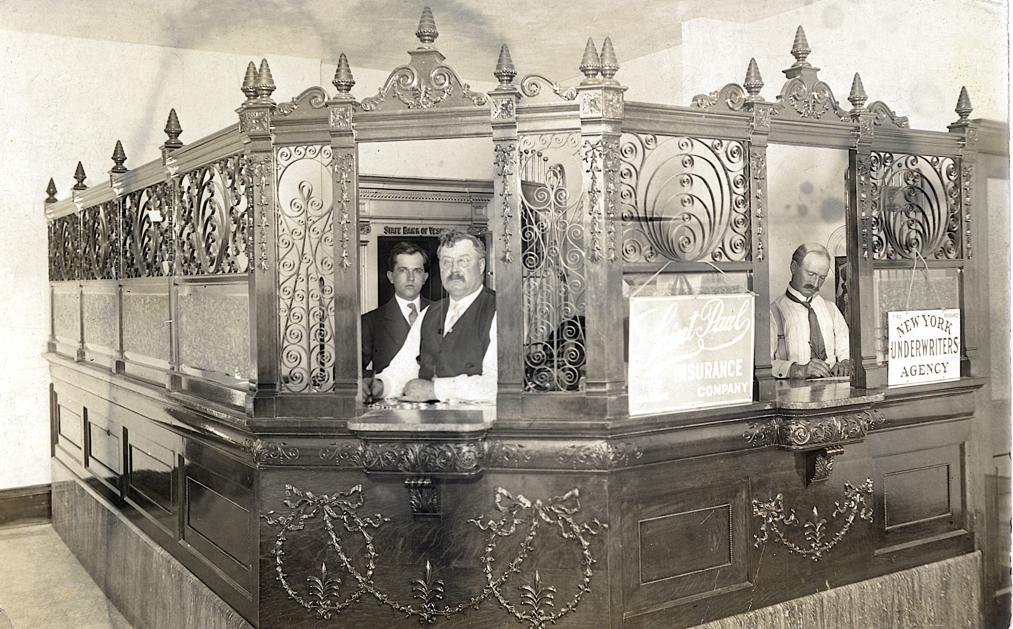 This photograph from my Grandmother Ruby V. Hanneman shows the interior of the State Bank of Vesper in the village of Vesper, Wisconsin, circa 1912. Scrawled on the back of the photo in pencil is the following notation: “First Vesper Bank. Jones Cashier, Martin President, Oliver V-P.”