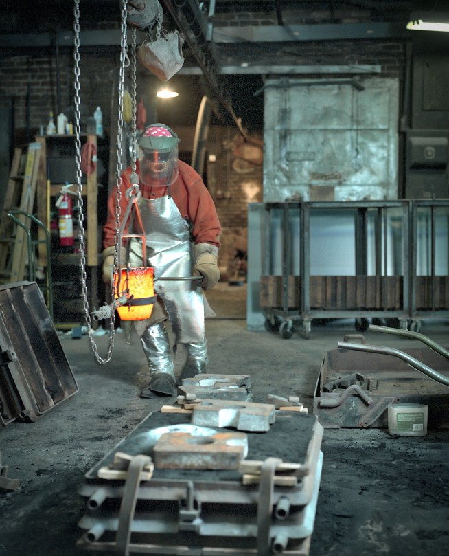 Pankratz moves the bucket of molten metal with the aid of a hoist.