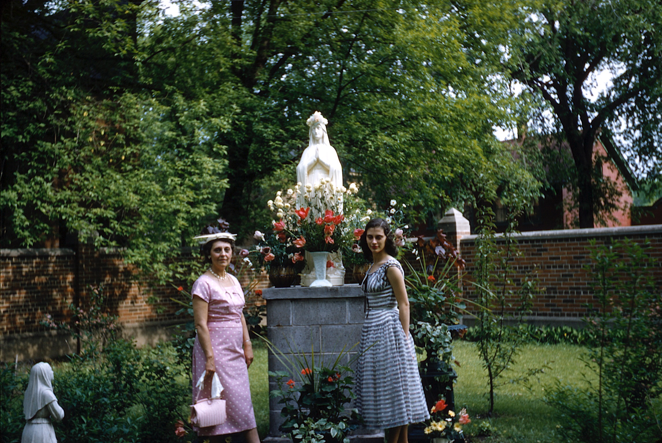 Ruby Hanneman and daughter Lavonne before a statue of the Blessed Virgin Mary on the campus of Viterbo College.
