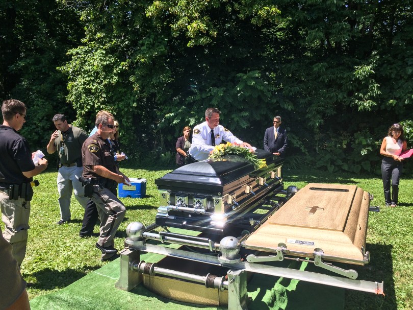 Racine County Sheriff Christopher Schooling sets his gloves on the casket.