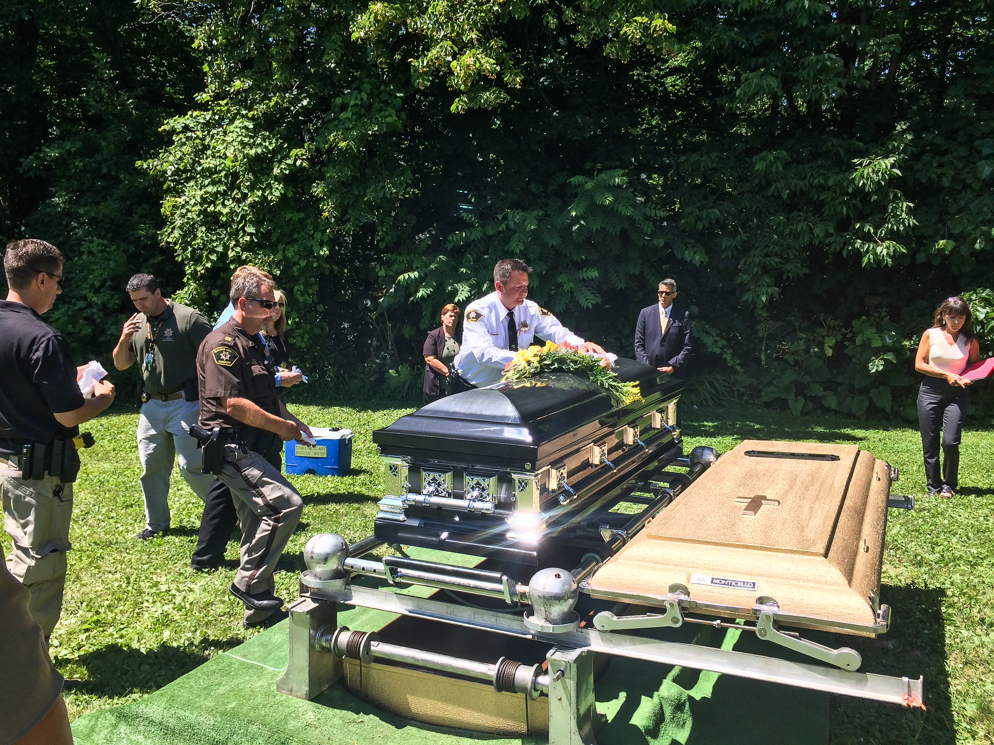 Racine County Sheriff Christopher Schooling sets his gloves on the casket.