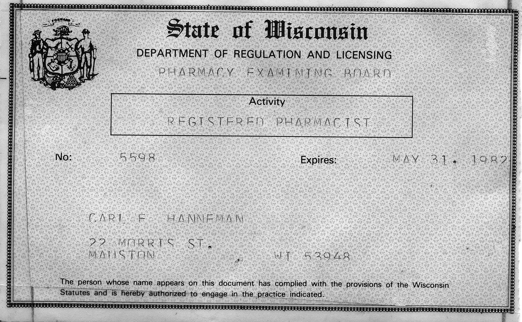 The last pharmacist license issued to Carl F. Hanneman by the board of pharmacy. It was still in effect on the day he died in May 1982.