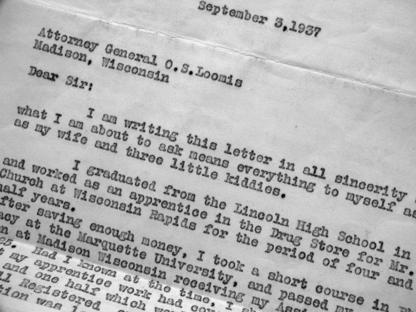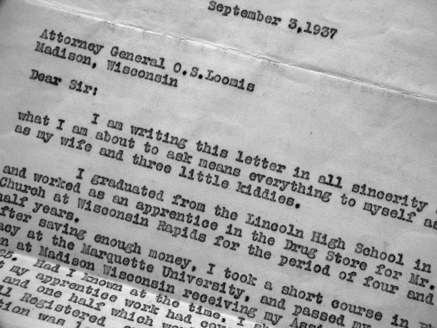 Carl Hanneman wrote to Wisconsin Attorney General Orland S. Loomis in 1937, seeking help with his pharmacist’s license. Read more about that story here: https://hannemanarchive.com/2014/12/30/carls-1937-plea/