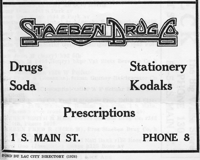 In 1926 and 1927, Carl F. Hanneman worked for the Staeben Drug Co. in Fond du Lac, Wisconsin.