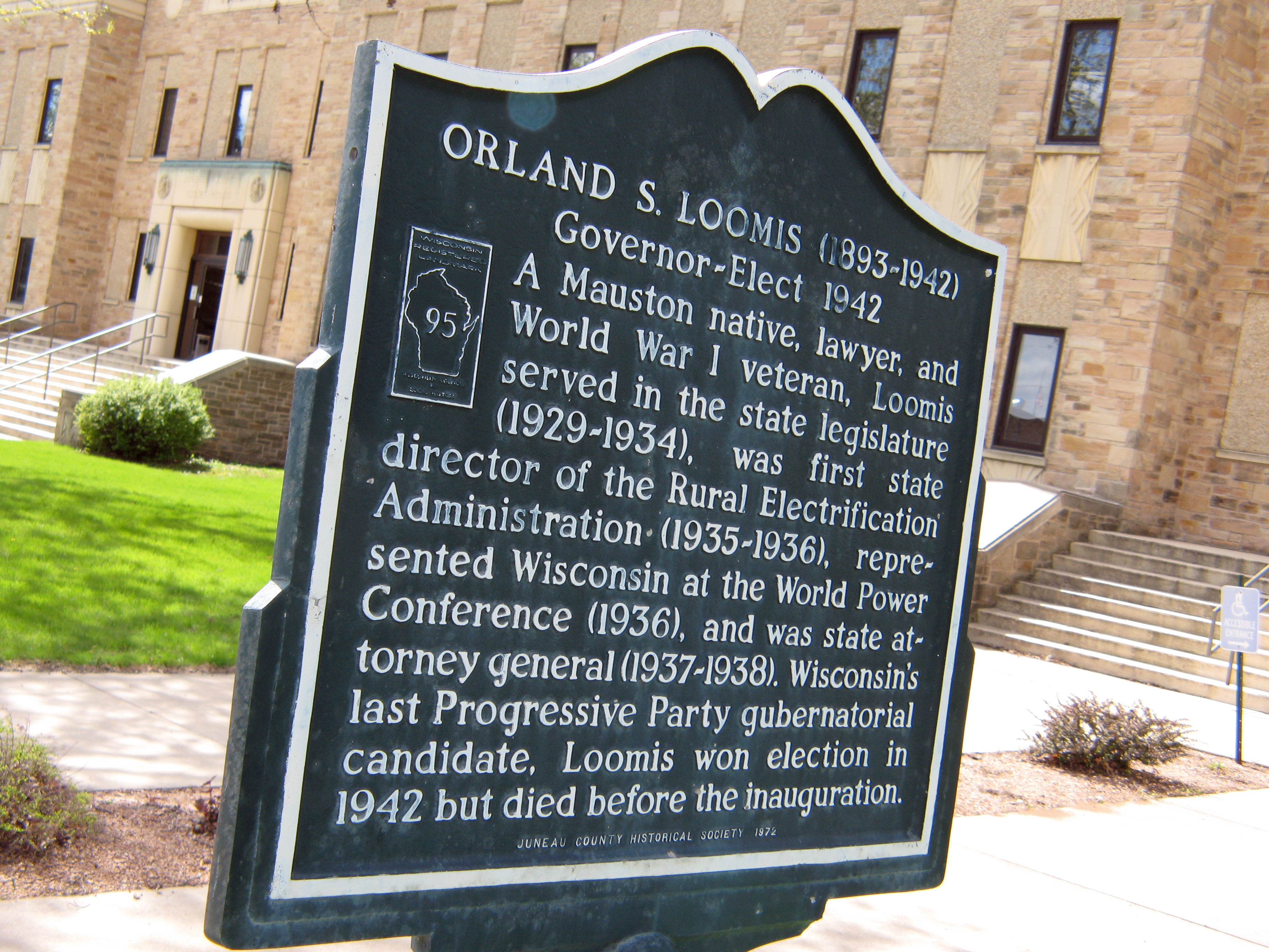 This historical marker dedicated to Orland Loomis stands outside the Juneau County Courthouse in Mauston.