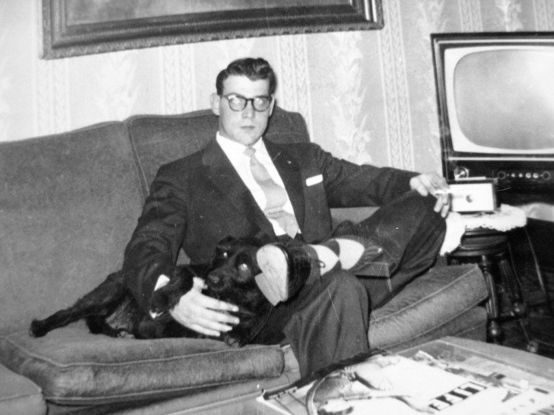 David D. Hanneman and dog Bubbles sit under the Loomis painting, circa 1950.