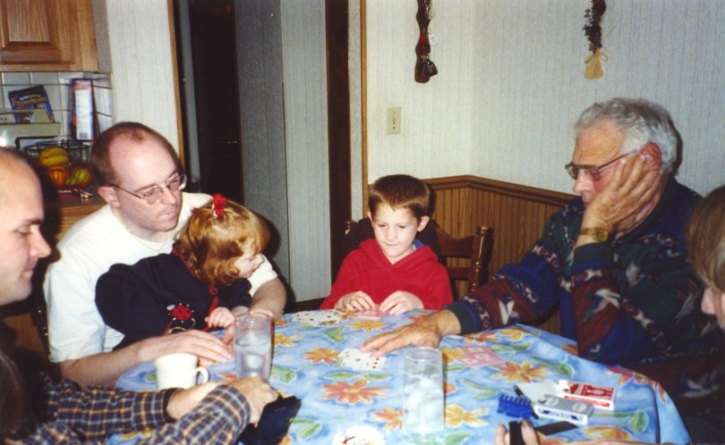 Grandpa Dave plays cards with grandchildren Samantha and Stevie Hanneman while Joe and David Hanneman look on.