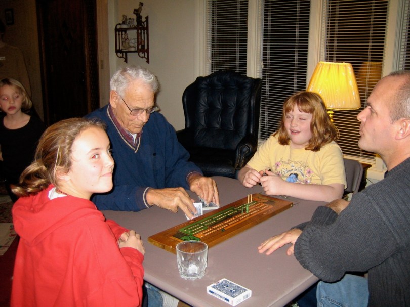 Abby and Samantha Hanneman watch Grandpa Dave play cribbage with son David.