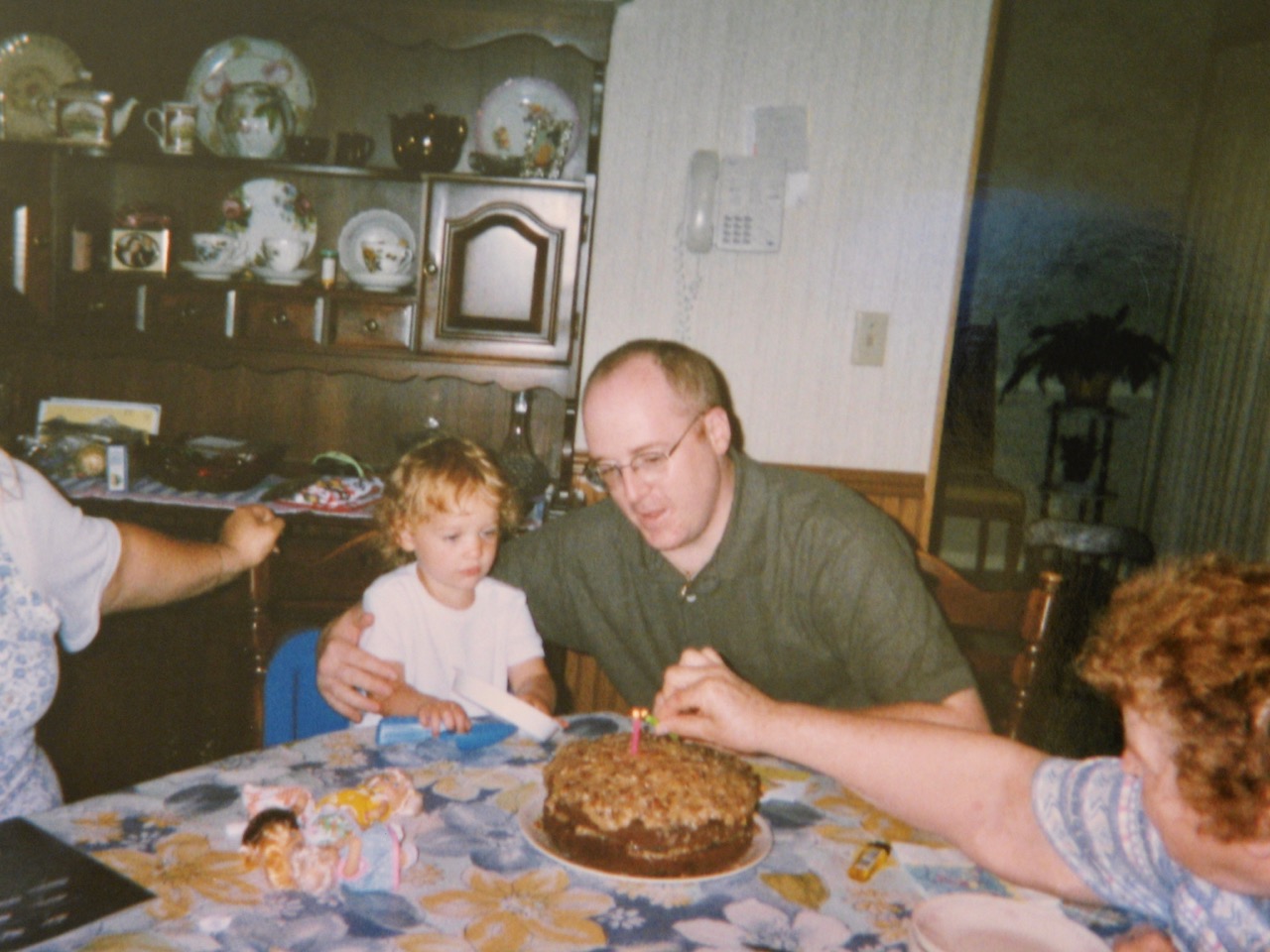 Grandma Mary lights a birthday candle for son Joe as granddaughter Ruby looks on.
