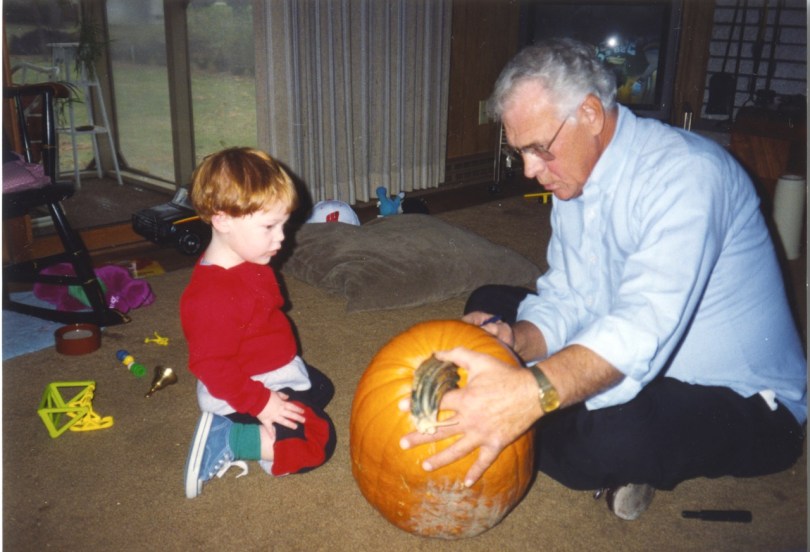 Grandpa Dave teaches Stevie how to carve pumpkins.