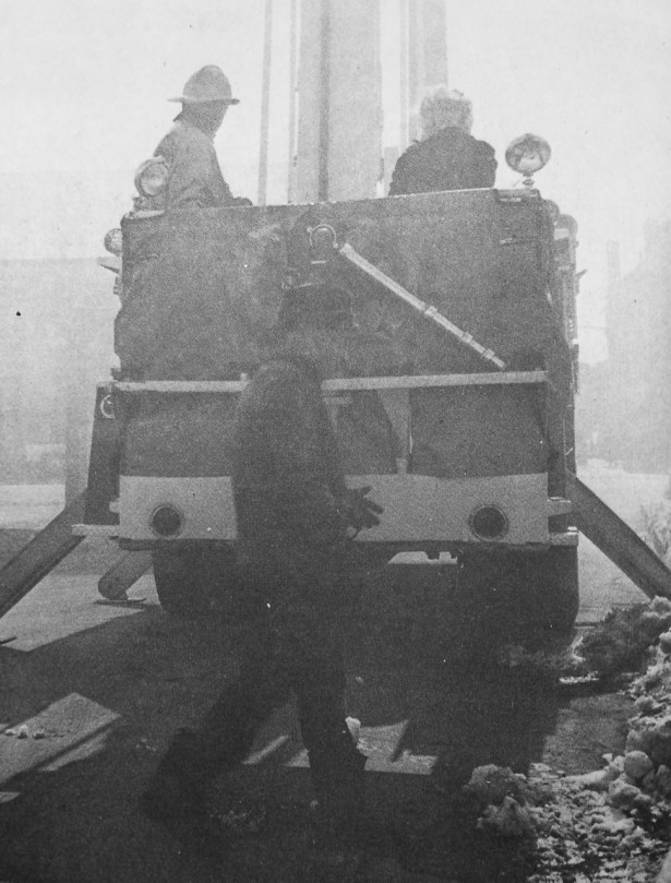 A snorkel truck was used in the dramatic rescue of Margaret McGonigle, owner of the drug store building, who was trapped on the roof. (Sun Prairie Star-Countryman photo)