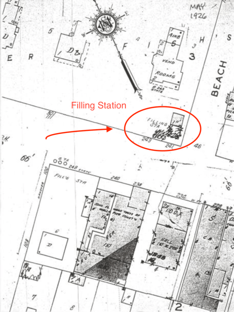 Rossin estimated the original Standard station was built in the late 1940s. The situate the corner of State and Beach streets earlier housed a small gasoline filling station, according to a May 1926 Sanborn fire insurance map (see below). Sanborn maps from 1894 and 1909 show no structures on the site. The brick rooming house behind the filling station was shown on all three Sanborn maps. That home is still there today.