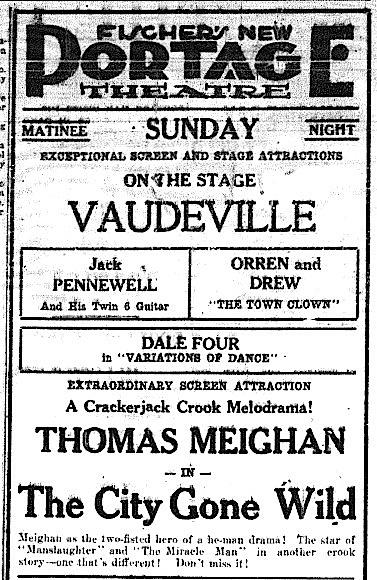 Helen and June walked to the movie theater to see the 2:30 matinee. Fischer’s New Portage Theatre on West Wisconsin Street was a brand new movie house with more than 350 seats and a stage for live performances. The girls paid the 15-cent admission for an afternoon that included Louise Brooks and Thomas Meighan in the silent film The City Gone Wild. Other attractions included live Vaudeville performances by “guitar ace” Jack Pennewell and his Twin-Six Guitar, and impersonators Orren and Drew performing “The Town Clown.” Throw in some short film features and newsreels and the afternoon quickly disappeared.