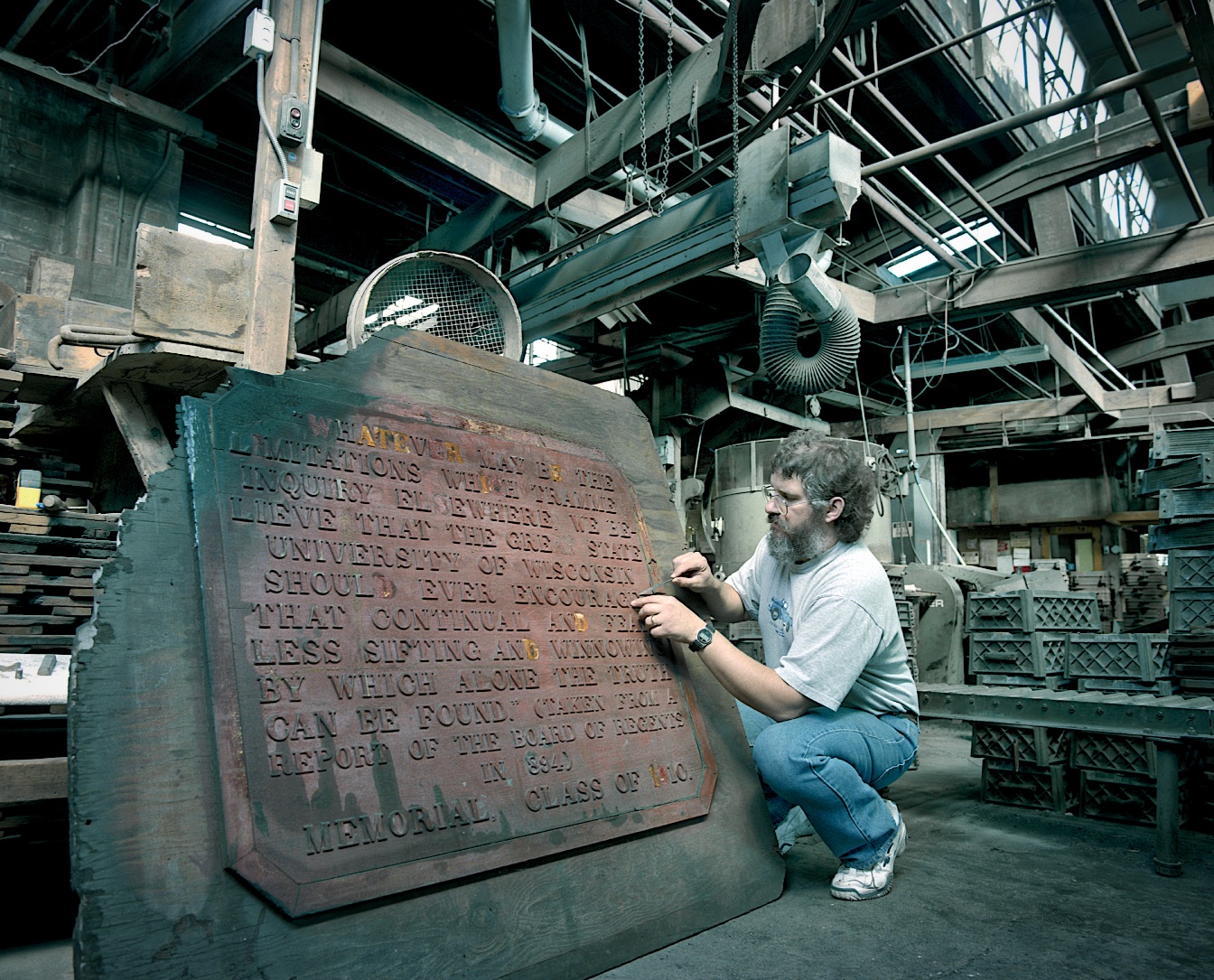 The Madison Brass Works technically no longer exists. Now called Celestial Stone Foundry and Forge, the company and its one employee/owner helped repair and restore UW-Parkside’s two sifting and winnowing plaques and cast a rededication plaque using the very same pattern-maker’s letters from the original.