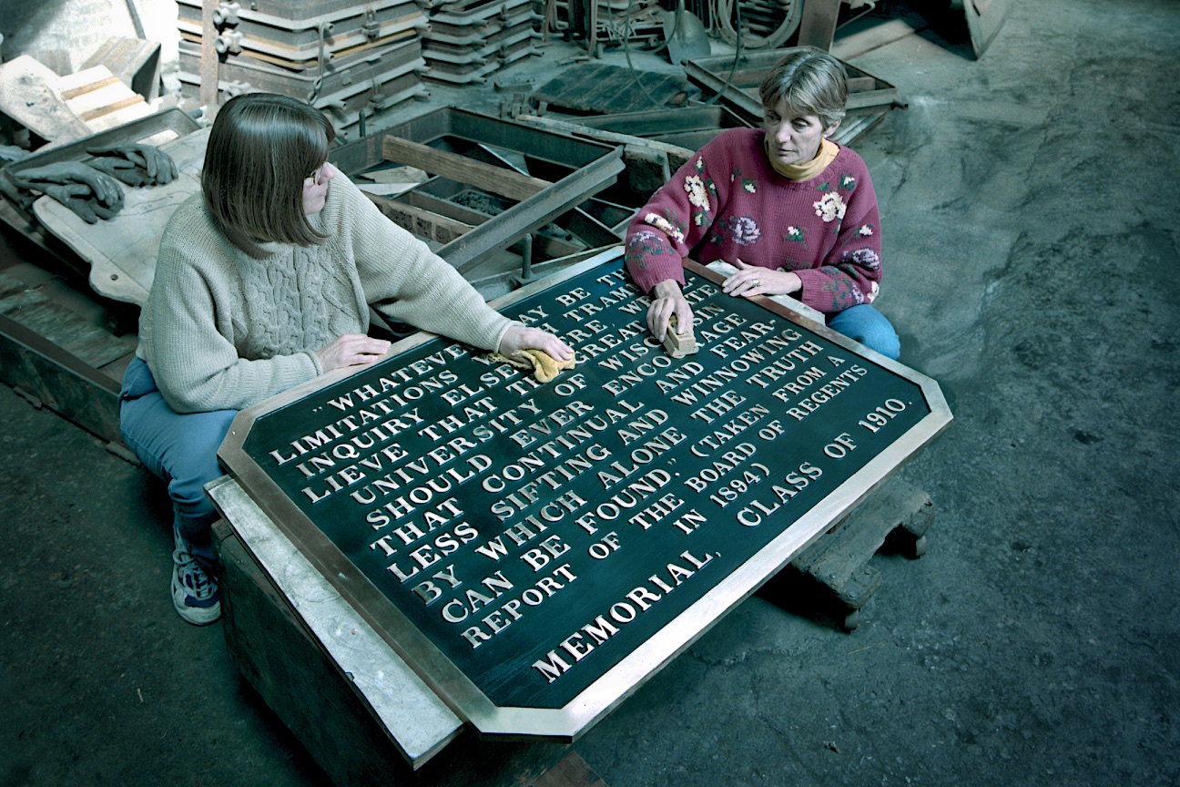 Artists Martha Glowacki and Mary Dickey of Sylva Designs of Sauk City worked with Pankratz to repair and restore the two 4-by-4-foot plaques. The UW-Parkside plaques were cast in 1964. The holes drilled in the plaques when they hung at the old UW Centers in Racine and Kenosha were welded and new holes drilled to match the original plaque. The black surface under the brass letters was repaired and repainted. The brass surfaces were machine- and hand sanded and polished. At completion, the restored plaques had a luster probably matched only by the original sheen.