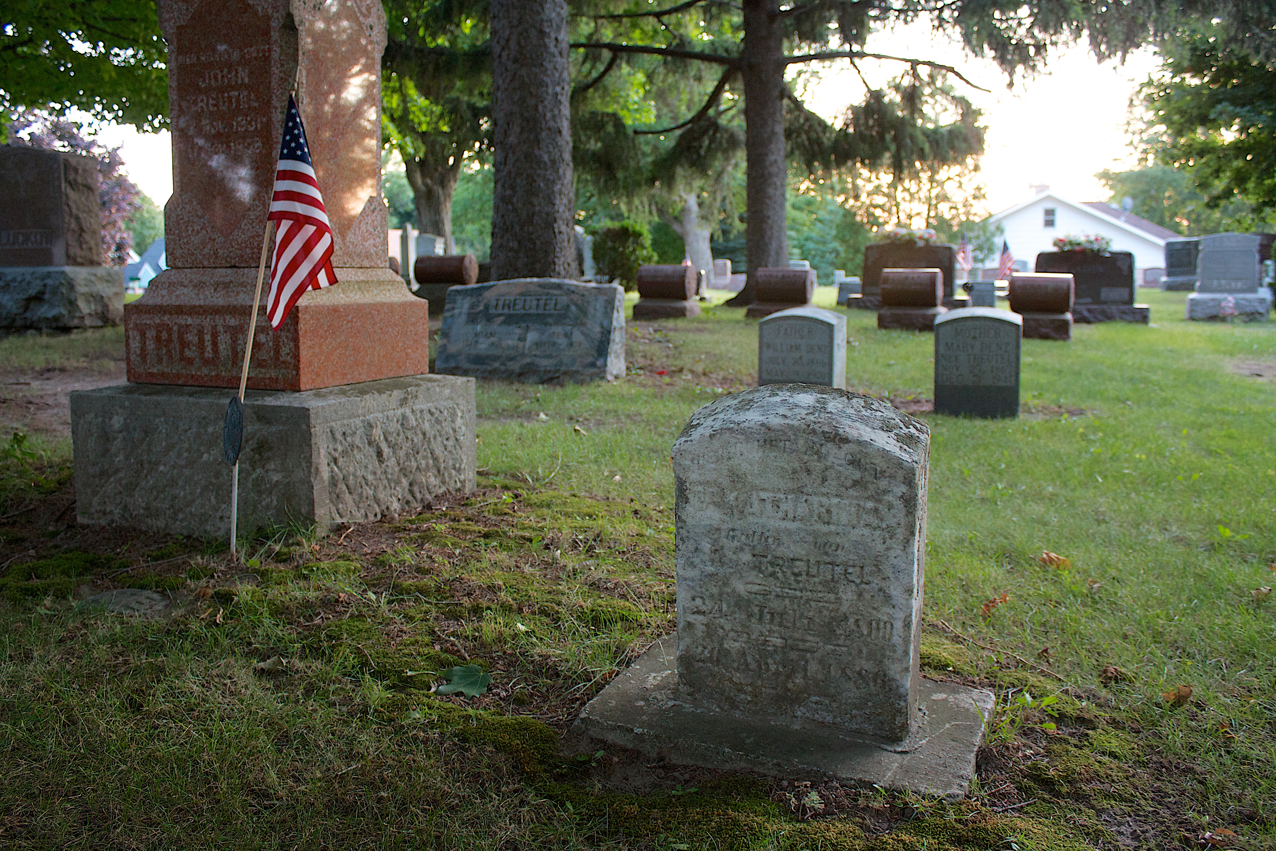 Joe Ladick was actually buried at Holy Rosary Catholic Cemetery in the Town of Sigel. His is one of the earlier monuments in the cemetery. On a recent trip to the area, we cleaned his marker using Treasured Lives RestoraStone™ process, which removed biological growths, dirt and air pollution from the stone. Now, thanks to a generous cousin, this beautiful stone is no longer the only visual history we have of him.