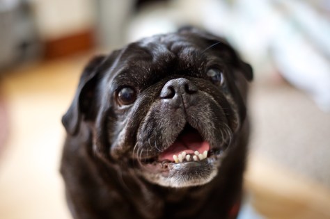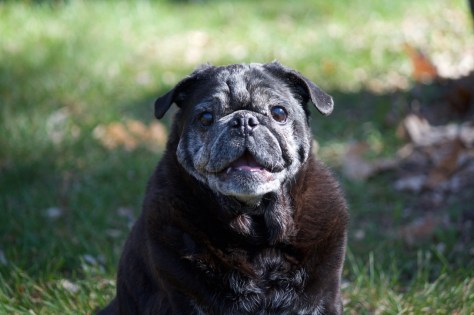 Even as Mr. Puggles’ rear legs began to fail, we still found ways to enjoy the outdoors. I bought a hip harness from a web store that caters to disabled pets. It gave his Pug caboose just enough help to still be able to roam about the yard, marking every tree and barking at falling acorns and the occasional brave squirrel. I felt slight pangs of dread as his face turned from jet black to salt and pepper. I would not want to face losing him, so I pushed those thoughts aside.