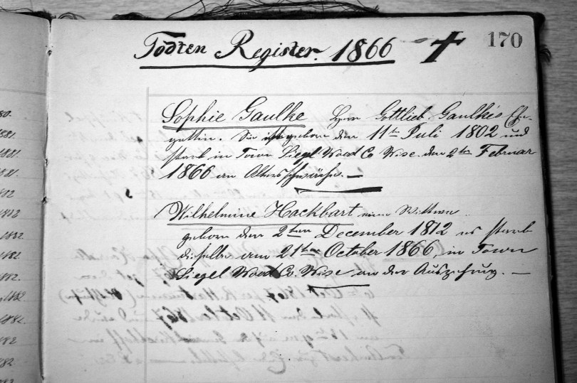 The first two deaths in the parish register at St. John’s Lutheran Church in Kellner, Wisconsin are Sophie Gaulke and Wilhelmine Hackbart.