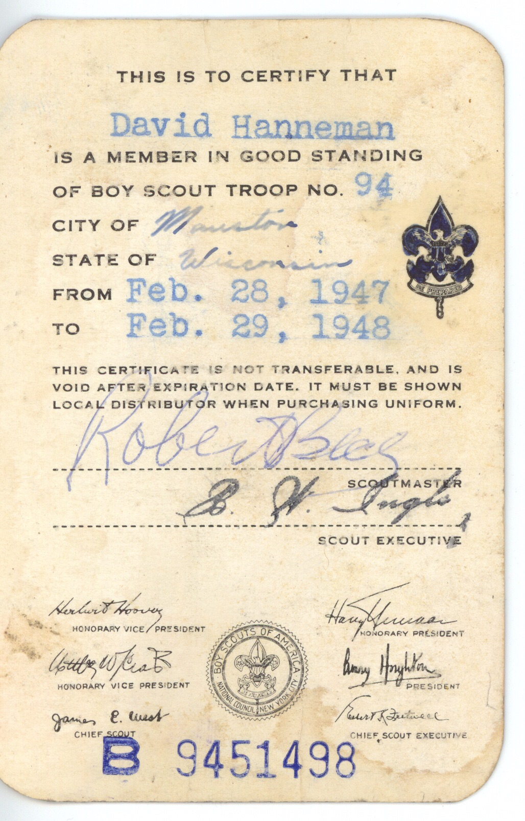 The back side of the Boy Scouts of America membership card of David D. Hanneman of Mauston, Wisconsin.