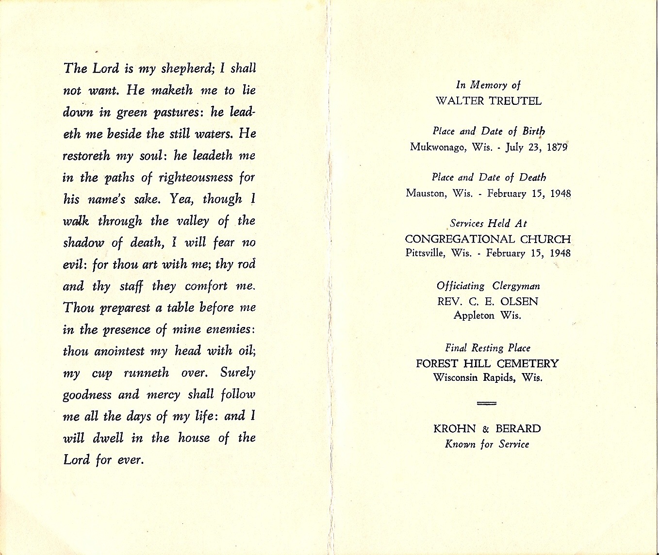 The prayer card given at the funeral of Walter Treutel of Vesper, Wisconsin.