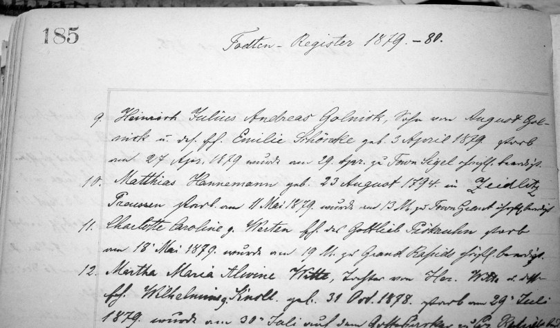 The death of Matthias Hannemann on May 11, 1879 is recorded in the parish register at St. John’s Lutheran Church in Kellner, Wisconsin.