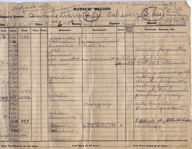 Chart from the December 1939 hospitalization of David D. Hanneman for pneumonia.