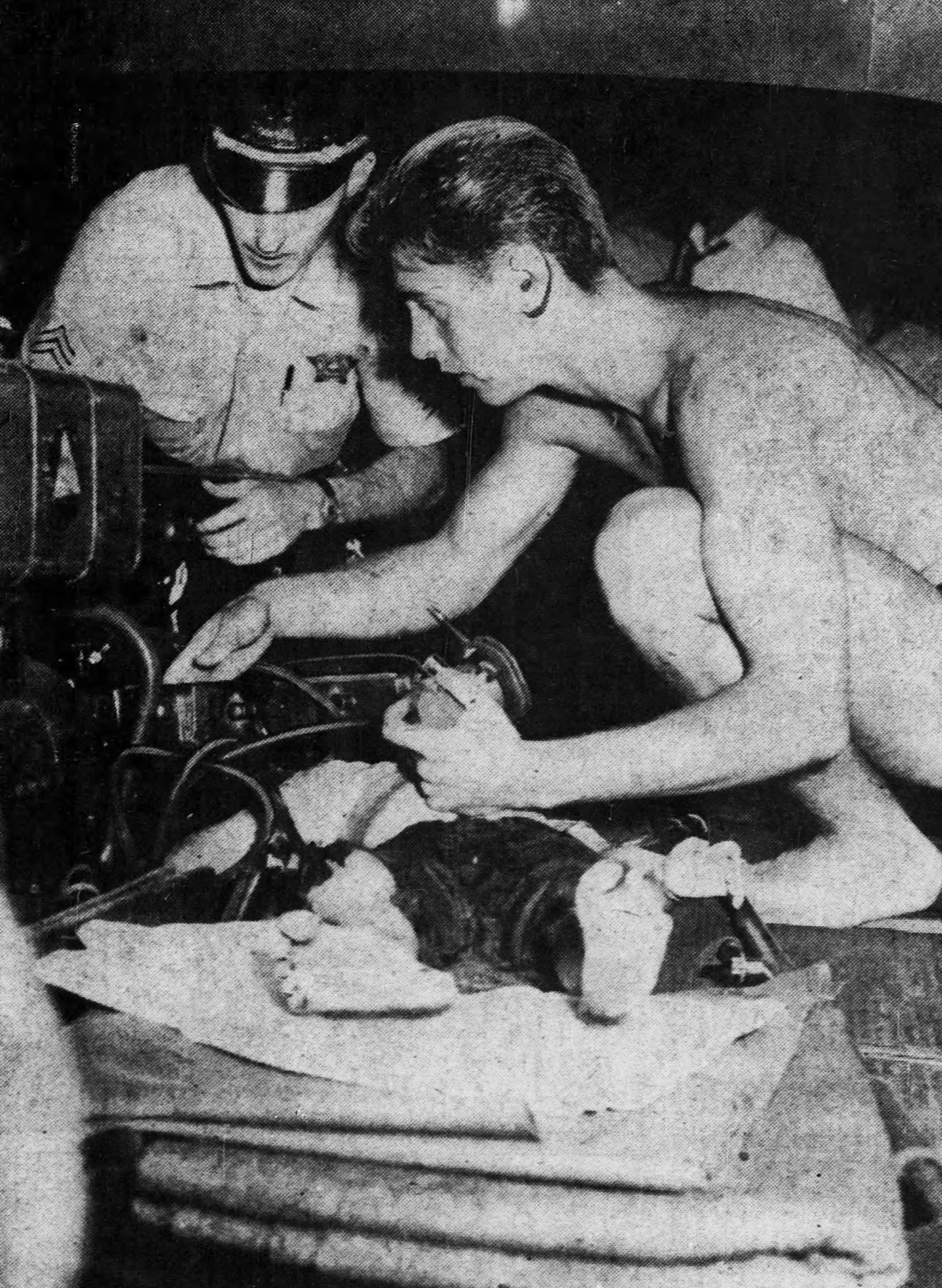 A lifeguard and police officer administer oxygen to Catherine Rickman, 4, after she was plucked from the waters of Lake Michigan after a plane crash. She was revived momentarily but died on the way to the hospital.